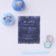 Veuillez noter que cette invitation est sur papier de prospectus et très mince. Les enveloppes ne sont pas incluses. Pour des invitations plus épaisses (même conception), veuillez visiter notre magasin. Un faire-part de mariage moderne et élégant de renouvellement de voeux. Arrière - plan bleu marine décoré avec des étincelles de parties scintillant faux argent. La couleur bleue est inégale. Personnalisez et ajoutez vos noms et les détails de votre fête. Lettres de couleur blanche.
