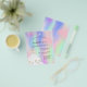 Veuillez noter que cette invitation est sur papier de prospectus et très mince. Les enveloppes ne sont pas incluses. Pour des invitations plus épaisses (même conception), veuillez visiter notre magasin. Une invitation moderne, élégante et glamour pour une Quinceañera, 15ème anniversaire. Arrière - plan holographique rose, violet et vert menthe avec parties scintillant faux rose, étincelles et robe blanche. Le nom est écrit avec un script de style moderne écrit à la main. Personnalisez et ajoutez les détails de votre fête.
