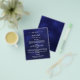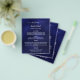 Veuillez noter que cette invitation est sur papier de prospectus et très mince. Les enveloppes ne sont pas incluses. Pour des invitations plus épaisses (même conception), veuillez visiter notre magasin. Un menu mariage classique. Un arrière - plan bleu marine. La couleur bleue est inégale. Texte blanc. Personnalisez et ajoutez votre nom, votre date et le menu. Vous pouvez ajouter du texte, des photos à l'arrière.