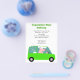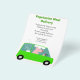 Flyer mignon pour votre entreprise de livraison de repas végétariens. Un cochon portant un chapeau de chef conduit une voiture avec de la nourriture fumante sur le siège arrière. Idéal pour les traiteurs spécialisés dans la cuisine végétarienne et végane.