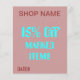 Un flyer très coloré faisant la publicité d'une vente d'ouverture pour un magasin de femmes, couleur de fond sarcelle. Le panneau en haut a un fond mauve aqua. Le texte noir est assis sur fond blanc > lit " Vente d'ouverture ". Au dos > 15% de réduction sur les articles, place pour le nom du magasin et les heures. Images de vêtements, de sacs et de chaussures.