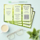 Brochure de prospectus pour les petites entreprises pour customiser des deux côtés et se plier en trois. L'arrière - plan à thème de la nature est l'herbe verte avec des fleurs et le soleil. Tout le texte est violet foncé. Chaque côté de ce papier de format 5x8 comporte trois sections avec des modèles de texte. Ajoutez également un logo, un code QR et / ou une photo dans les espaces prévus. Si vous ne voulez pas utiliser un ou plusieurs supports d’image, retirez-le en accédant à l’outil "modifier dans la conception" qui se trouve en faisant défiler vers le bas de la zone de personnalisation. Dans la zone de conception choisissez l'image en cliquant dessus, puis appuyez sur le symbole "poubelle" pour cette image. Le fait de modifier la taille du papier peut modifier la conception de manière à ne pas s'adapter correctement. Contactez-moi si vous voulez de l’aide.