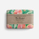 Une feuille d'emballage de savon avec un design avec des tranches de pamplemousse rose sur un arrière - plan vert.