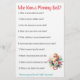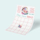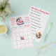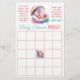 Petite petite fille dans un baby shower à thème de plage de coquillages carte de bingo d'un côté et l'autre a, "Qui connaît maman le mieux" jeu.