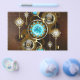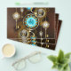 Turquoise lenses with antique watch with brass gears and golden keys on rusty, brown background. Steampunk style.