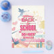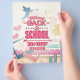 Bienvenue Retour à l'école 50% de réduction Promo flyer avec une typographie blanche. Un arrière - plan blanc moderne avec un collage coloré sous typographie rose. Le collage mignon comprend un chérubin bleu, des formes d'image qui sont colorés et amusants motifs en bleu, et rose. D'autres graphiques comprennent des formes découpées d'oiseaux et de bulles vocales, des rubans colorés, dentelle et vérifier la garniture du fond motif, ainsi que deux coeurs roses.