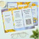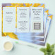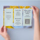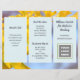 Brochure commerciale feuille de gingko jaune pour customiser des deux côtés et se plier en trois. Chaque côté de ce papier de format 8x11 pouces a trois sections bleu clair avec des modèles de texte. Ajoutez également un logo, un code QR et / ou une photo dans les espaces prévus. Si vous ne voulez pas utiliser un ou plusieurs supports d’image, retirez-le en accédant à l’outil "modifier dans la conception" qui se trouve en faisant défiler vers le bas de la zone de personnalisation. Dans la zone de conception choisissez l'image en cliquant dessus, puis appuyez sur le symbole "poubelle" pour cette image.