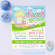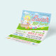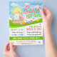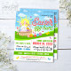 Donnez vie à votre évènement de chasse aux oeufs de Pâques et faites de la publicité avec ce prospectus adorable et coloré qui présente un lapin blanc dans un panier rempli d'oeufs colorés de Pâques, de papillons, de fleurs, d'herbe, un ciel bleu et ensoleillé rempli de nuages.