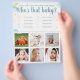 Jeu de baby shower amusant - devine le bébé ! Faites correspondre les invités avec leurs photos de bébé. Devine le bébé est le jeu de baby shower le plus adorable, amusant et créatif sur le marché ! Devine le bébé permet facilement à de nombreux invités de jouer encore et encore. Faites simplement correspondre les invités avec leurs photos de bébé et essayez d'être le gagnant du jeu d'aujourd'hui ! Le design est disponible uniquement sur des flyers de 8,6 x 11 pouces. Si vous le souhaitez sur un autre type de papier, vous pouvez facilement le transférer. Vous pouvez changer toutes les images et les noms des invités.