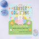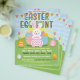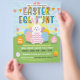 Le prospectus de l'événement de chasse aux oeufs de Pâques mignonne contient un joyeux lapin blanc de Pâques tenant un oeuf, des oeufs colorés, une bannière, une typographie amusante et colorée, de l'herbe verte et des fleurs. Customisez à votre goût.