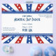 Cet ensemble amusant a une atmosphère moderne fraîche avec un arrière - plan blanc éclatant avec des rayures rouges et bleues avec des étoiles blanches dans un amusant motif éclat de rayons. Au centre, il y a une entrée blanche avec des bordures fines bleues. La Journée commémorative est un grand moment pour honorer et commémorer nos anciens combattants et nos héros morts au combat et célébrer notre pays - et nous le faisons tous de différentes manières. Que vous planifiez une fête, que vous montiez des prospectus pour une parade ou que vous souhaitiez invitation les voisins à un pique-nique barbecue, vous trouverez tout ce dont vous avez besoin. Il y a aussi des invitations, des dépliants, des cartes postales, des t-shirts, des sacs et d'autres cadeaux !