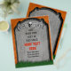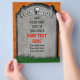 Cette décoration de fête d'Halloween effrayante montre une pierre tombale avec un crâne et des os croisés et les mots "Ci-gît...". Le fond derrière la tombe est orange strié avec de l'herbe en bas. Ajoutez vos détails de célébration en utilisant les champs de modèle ou supprimez les exemples de texte modèle pour laisser vierge. Si vous aimez les cimetières gothiques et l'organisation de fêtes d'Halloween terrifiantes, c'est la décoration sinistre qu'il vous faut. Voir les articles assortis dans notre magasin !