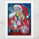 Peinture acrylique colorée, capricieuse et artistique, Père Noël joue du violon dans la nuit d'hiver enneigée, un hibou, ornements floraux, plantes d'hiver, baies sèches dans des couleurs rouge vif, vert, blanc, bleu, jaune.