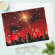 Le Père Noël avec son Reindeer volant dans un traîneau au-dessus de la ville. Ciel nocturne rouge et flocons de neige. frontiernow.com