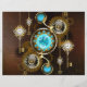 Turquoise lenses with antique watch with brass gears and golden keys on rusty, brown background. Steampunk style.