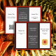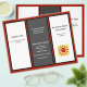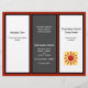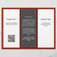 Brochure de prospectus d'affaires en noir, rouge et blanc avec six panneaux pour le texte, sur les deux côtés du papier de 8,5 x 11 pouces. La première partie a deux panneaux blancs avec un panneau gris foncé au centre. L'arrière - plan est rouge foncé. Ce côté sera les pages extérieures de la brochure lorsqu'elle sera pliée. Ajoutez un logo à la première page en utilisant le modèle. La deuxième partie contient le texte des pages intérieures, ainsi qu'un emplacement pour un code QR. Le centre est pour une section "à propos".