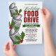 Circulaire de collecte de fonds minimaliste de Holiday Food Drive, comprenant des conserves empilées et des butinettes vertes recouvertes de neige. Décor aux couleurs de vacances audacieuses et typographie élégante.