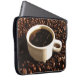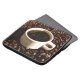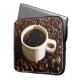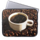 Cette pochette pour ordinateur portable présente une tasse de café blanc demitasse, fraîchement moulu à la vapeur, posée sur un lit de grains de café rôtis brun foncé.
