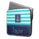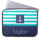 Pochette d'ordinateur portable marine avec motif rayé bleu turquoise et bleu marine et texte personnalisable.