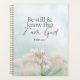 Planificateur personnalisé avec une citation inspirante L'écriture représente un simple jardin botanique avec de jolies fleurs roses et un arrière - plan bleu doux. Il présente la Bible Verse Psaume 46:10, "Soyez calme et sachez que je suis Dieu." Customisez le dos avec un nom ou des détails de votre choix.