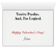Une carte romantique humoristique pour la Saint Valentin, un Anniversaire, ou juste pour dire "Je t'aime" à tout moment pour le couple gay qui se connecte plus sur un plan intellectuel que physique. Et, c'est aussi pour le couple qui a un sentiment d'humour sur leur relation. Vous êtes libre de customiser l'occasion et de la modifier ou de la supprimer dans le texte intérieur. Conçu par Sheila Cicchi, Brownielocks.com, Tous droits réservés.