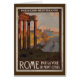 Une carte de vœux avec une illustration du Forum Romain à l'aube. Avec une publicité de voyage vintage pour le service de train de Paris à Rome via Lyon. Sur un fond brun foncé.