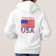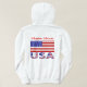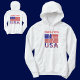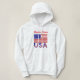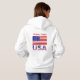 La sweat - shirt à capuche féminine personnalisée porte le drapeau des Etats-Unis d'Amérique, ou, le drapeau américain avec les lettres USA en bas dans le rouge, blanc et bleu avec étoiles et rayures, trouvé dans le drapeau. Personnalisez en ajoutant votre nom, ou, pour un cadeau créatif, ajoutez le nom de quelqu'un d'autre. Amusement pour les célébrations de la fête de l'Indépendance et les réunions de famille.