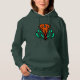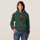 "A stylish women's pullover hoodie featuring a vibrant orange and green abstract pattern on a deep forest green base. Comfortable, unique, and perfect for adding an artistic touch to your streetwear."