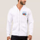 Stay warm with this rugged men's full-zip hoodie featuring a bold cartoon crab design. The graphic prominently displays a big-clawed, happy red crab enjoying the beach scene, complete with a blue ocean and a distant coastal lighthouse. This versatile hooded jacket is ideal for cool weather, outdoor activities like boating or fishing, or simply for casual comfort. It's a great addition to any wardrobe, appealing to those who appreciate fun marine animal artwork and high-quality, comfortable apparel.