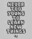Motivation Phrase sur les côtés avant et arrière des T-shirts avec citation : "Jamais trop jeune pour apprendre de nouvelles choses". L'image arrière est personnalisable.