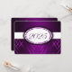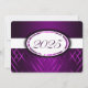 Invitation à la graduation violette et blanche avec rayures violet clair et foncé et un ruban blanc qui traverse pour montrer l'année de la graduation. Le dos de la carte est violet avec une police blanche pour que les gens puissent remplir les annonces de remise de diplômes.