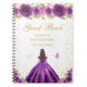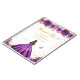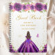 Ce livre d'or élégant et glamour présente une belle princesse aux cheveux brunes et à la peau claire dans une robe de bal violet foncé. Le texte combine écriture manuscrite et polices sans serif modernes pour un look élégant et sophistiqué. Les compositions florales, les papillons et les confettis d'or créent un mélange parfait de rustique et de chic. Graphiques par www.etsy.com/uk/shop/SunflowerDayLove