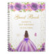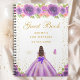 Ce livre d'or élégant et glamour présente une belle princesse aux cheveux brunes et à la peau claire dans une robe de bal violet. Le texte combine écriture manuscrite et polices sans serif modernes pour un look élégant et sophistiqué. Les compositions florales, les papillons et les confettis d'or créent un mélange parfait de rustique et de chic. Graphiques par www.etsy.com/uk/shop/SunflowerDayLove