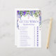Cette jolie glycine violette Guess Who? nuptiale feuille de douche est élégant et charmant - parfait pour tout jardin, botanique, rustique, romantique, floral, formel ou vintage mariage. Son mélange exquis de gracieuses fleurs violettes et roses multicolores et de verdure feuillue est fleurie, délicate et belle. Ce jeu amusant et facile est sûr d'apporter beaucoup de rire à toute douche nuptiale! Donnez simplement un drap à chaque invité (n'oubliez pas les stylos) et laissez le plaisir commencer! Vous serez surpris de voir combien de personnes connaissent réellement certaines des réponses. Pour faire de ce jeu de douche nuptiale votre propre sélection Personnalisez ce modèle et tapez le nom de la mariée et le nom du marié.