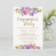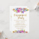Cette invitation à la fête de fiançailles d'or de jardin violet est parfaite pour un mariage à thème fleuri. Le design est composé de magenta clair, rose, prune, violet et fleurs bleues, et d'une belle police de script de feuille d'or faux. Personnalisez les invitations avec le nom de la prochaine à être mr et mrs et vos détails de l'événement. Sur le support, une couronne fleurie colorée est ornée des mots "elle a dit oui !". Remarque : Ce design ne comporte pas de véritable feuille d'or. C'est un graphisme de haute qualité fait pour ressembler à un shimmer d'or.