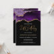 Cette élégante invitation de 21ème anniversaire présente une aquarelle d'une géode d'agate dans les tons violet avec des reflets d'or. Les mots "21e anniversaire" apparaissent dans la parties scintillant en faux or dans la police décorative moderne d'écriture manuscrite. Customisez-le avec le nom de l'invité d'honneur en texte doré et les détails en blanc. La même image d'agate violette apparaît à l'envers.
