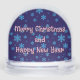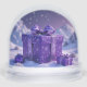 Nos cadeaux de Noël violets Snow Globe présente trois cadeaux de Noël enveloppés dans du papier d'emballage violet brillant avec un motif de flocon de neige. Tous les textes sont personnalisables.