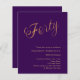 Une invitation design et moderne pour une fête de 40e anniversaire. Un arrière - plan de couleur violette et le mot Quarty écrit avec d'élégantes grandes lettres de script en faux or. Personnalisez et ajoutez un nom et des détails du parti. 1 feuille = 1 invite imprimé bord à bord.