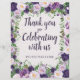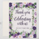 Thank your guests in style with this elegant “Thank You for Celebrating with Us” sign, designed to add a beautiful finishing touch to your event. Featuring a soft watercolor floral border in shades of lavender, plum, and fresh greenery, this design creates a romantic garden-inspired feel that complements weddings, bridal showers, milestone birthdays, and special celebrations. The graceful script lettering paired with classic serif accents ensures the message is both warm and easy to read. The added “Please Take One” line makes it perfect for guest favor tables, encouraging guests to enjoy a thoughtful takeaway. Printed on a smooth 12.5 pt paper sheet, this sign is lightweight yet polished—ideal for framing or displaying on a tabletop or easel. A lovely coordinating piece for floral-themed event décor.