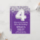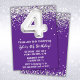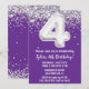 Purple et argent 4ème anniversaire invitation à la fête âge 4 anniversaire invitation à la fête avec parties scintillant et écriture de script moderne et ballons de papier amusant.