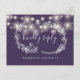 Une carte RSVP violette avec de jolies lampes à cordes, une guirlande florale dessinée à la main et une typographie chic. L'inverse vous donne vos détails et une demande amusante de chant invité. Conçu par Thisisnotme©
