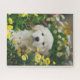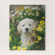 un adorable puzzle à l'image d'un chiot dans un jardin fleuri.