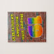 Ce dessin animé et passionnant urbain de rue et de graffiti sur le thème de l'anniversaire jigsaw puzzle design comporte un grand nombre "19" avec un dégradé coloré arc-en-ciel inspiré motif, avec le message "Happy 19th Birthday," et un nom personnalisé. L'arrière - plan dispose d'un motif mural en brique. Un puzzle d’anniversaire coloré et personnalisable comme celui-ci pourrait être donné pour célébrer le dix-neuvième anniversaire de quelqu’un. [~Z0000545]