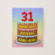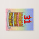 This fun and colorful birthday themed jigsaw puzzle design features a cartoon-style depiction of a three-tier birthday cake having numeral-shaped candles on top showing the number “31“, along with the message “HAPPY 31ST BIRTHDAY,”, and a customizable recipient name. The background features a multi-color pastel rainbow spectrum inspired gradient pattern. A cheerful, customized birthday puzzle like this might be a fun way to send birthday wishes to somebody who is celebrating their thirty-first birthday. [~Z0000621]