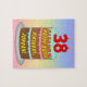 Ce puzzle à thème d'anniversaire joyeux et optimiste présente une représentation de dessin animé d'un gâteau d'anniversaire à trois niveaux avec des bougies en forme de chiffre sur le dessus montrant l'âge "38", avec le message "HAPPY 38TH BIRTHDAY," et un nom de destinataire personnalisable. L'arrière - plan a un motif multicolore pastel en arc-en-ciel inspiré du spectre dégradé. Un puzzle d'anniversaire coloré et customisé comme celui-ci pourrait être une façon amusante de donner des voeux d'anniversaire à quelqu'un qui célèbre son trente-huitième anniversaire. [~Z0000621]