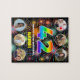 Ce design de puzzle d'anniversaire optimiste et audacieux comprend le numéro "42" avec un motif dégradé coloré inspiré du spectre arc-en-ciel, ainsi que le message "HAPPY 42nd BIRTHDAY", et un nom personnalisé, sur un feu d'artifice de célébration multicolore inspiré motif. En haut et en bas se trouvent des images qui peuvent être customisées, peut-être avec des photos du destinataire, et/ou de la famille et des amis du destinataire. Un puzzle d'anniversaire aussi excitant et personnalisé pourrait être une façon amusante de transmettre un message d'anniversaire à quelqu'un qui célèbre son quarante-deuxième anniversaire. (Photographie © Storytree Studios, Stanford, CA.) [~Z0000664]