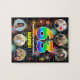 Cette conception amusante et audacieuse de puzzle en forme de casse-tête à l'occasion d'un anniversaire présente le nombre « 63 » avec un motif dégradé inspiré d'un spectre d'arc-en-ciel vibrant, ainsi que le message « JOYEUX 63e ANNIVERSAIRE », et un nom personnalisé, sur un motif multicolore inspiré de feux d'artifice célébrant l'événement. Près du haut et du bas, il y a des images qui peuvent être personnalisées, peut-être avec des photos du destinataire, et/ou de la famille et des amis du destinataire. Un puzzle de casse-tête d'anniversaire éditable et excitant comme celui-ci pourrait être une façon amusante d'envoyer un message de vœux d'anniversaire à quelqu'un qui célèbre son soixante-troisième anniversaire. (Photographie © Storytree Studios, Stanford, CA.) [~Z000066