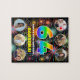 Ce dessin audacieux et joyeux de puzzle d'anniversaire comporte un grand nombre de "64" avec un motif multicolore inspiré du spectre arc-en-ciel, ainsi que le message "HAPPY 64th BIRTHDAY", et un nom modifiable, sur un motif inspiré par des feux d'artifice multicolores. En haut et en bas se trouvent des images qui peuvent être customisées, peut-être avec des photos du destinataire, et/ou de la famille et des amis du destinataire. Un joyeux puzzle d’anniversaire customisé comme celui-ci pourrait être envoyé pour célébrer le soixante-quatrième anniversaire de quelqu’un. (Photographie © Storytree Studios, Stanford, CA.) [~Z0000664]