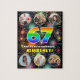 Ce design de puzzle amusant et optimisé sur le thème de l'anniversaire comprend le numéro "67" avec un motif dynamique inspiré du spectre arc-en-ciel, ainsi que le message "HAPPY 67th BIRTHDAY", et un nom personnalisable, sur un motif inspiré par l'éclatement de feux d'artifice multicolores festifs. On peut customiser les images qui se trouvent en haut et en bas, peut-être avec des photos du destinataire, de sa famille et de ses amis. Un puzzle d'anniversaire amusant et personnalisable comme celui-ci pourrait être une façon amusante de délivrer des voeux d'anniversaire à quelqu'un qui célèbre son soixante-septième anniversaire. (Photographie © Storytree Studios, Stanford, CA.) [~Z0000664]