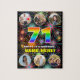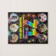 Cette conception de puzzle en forme de pièce à assembler sur le thème d'anniversaire joyeuse et dynamique présente un grand nombre « 71 » avec un motif de dégradé vibrant inspiré du spectre de l'arc-en-ciel, ainsi que le message « JOYEUX 71e ANNIVERSAIRE », et un nom personnalisable, sur un motif multicolore inspiré de feux d'artifice éclatants de célébration. Près du haut et du bas, il y a des images qui peuvent être personnalisées, peut-être avec des photos du destinataire, et / ou de la famille et des amis du destinataire. Un puzzle en forme de pièce à assembler d'anniversaire personnalisé et excitant comme celui-ci pourrait être une façon amusante de souhaiter un joyeux anniversaire à quelqu'un qui célèbre son soixante et onzième anniversaire. (Photographie © Storytree Studios, Stanford, CA.)
